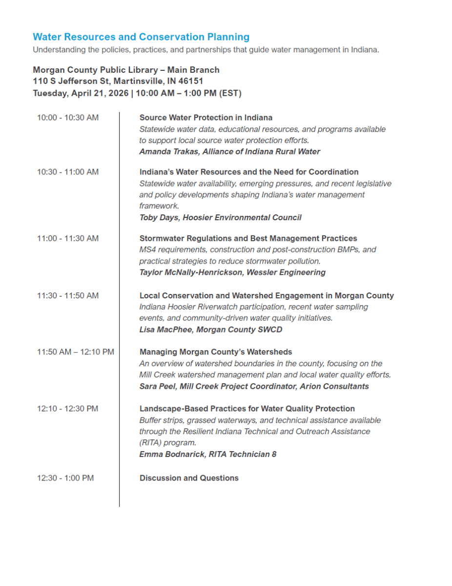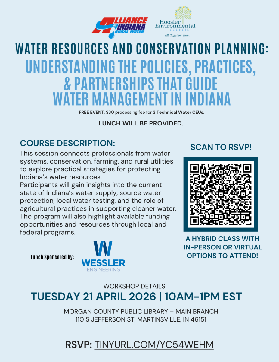 This session connects professionals from water systems, conservation, farming, and rural utilities to explore practical strategies for protecting Indiana’s water resources. Participants will gain insights into the current state of Indiana’s water supply, source water protection, local water testing, and the role of agricultural practices in supporting cleaner water. The program will also highlight available funding opportunities and resources through local and federal programs.